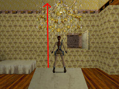 Begebt euch zurück auf die Ziegelmauer. Springt auf den Holzboden zurück und lasst euch von dort durch die Lücke auf den Kronleuchter hinunter fallen. Springt ohne Anlauf weiter auf den nächsten, jetzt niedrigeren, Kronleuchter. Weiter geht es, von der vorderen Kante, aus dem Stand auf den Untersten. Wendet euch nach links und springt mit Anlauf, Festhalten und Hochziehen nach links zu der Nische. Sammelt den Bibliothek-Schlüssel13/28 ein. Springt dann wieder zurück zum Kronleuchter. Bzw. lasst euch nach unten in den Raum fallen, klettert auf den schrägen Block und begebt euch zurück auf den unteren Kronleuchter. Springt mit Anlauf und Festhalten wieder zum mittleren Kronleuchter. Springt von dort mit Anlauf nach rechts zu der Fensternische mit dem nächsten Wandhebel und legt diesen um, um eine Falltür ins Wasser zu öffnen. Wenn ihr den Sprung von diesem Kronleuchter nicht schafft, könnt ihr auch zum höchsten zurück springen und von dort zum Wandhebel. Zerschießt nun die Fenster und begebt euch hinaus auf den Mauersims.Bibliothek