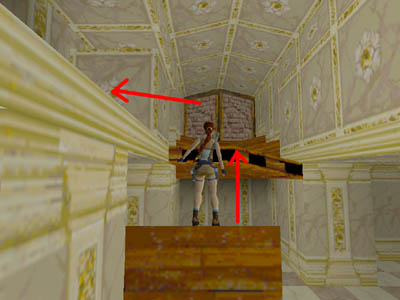 Zerschießt das Fenster und lauft auf den Balkon hinaus. Dort lauert ein weiterer Mafiosi Killer.17/37 Er verliert zweimal Uzi-Munition.10-11/28 (Hier schadet ein Blick nach unten nicht. Hinter der Ziegelmauer links gibt es später noch die Uzis zu finden.) Klettert rechts durch das nächste Fenster wieder ins Gebäude hinein. Von hinten kommt ein Schläger18/37 hinter euch her. Ein weiterer Schläger,19/37 in Begleitung seines Dobermann20/37 kommt von vorne. Nachdem diese erlegt sind, solltet ihr in den Kamin laufen. Schiebt dort den gut getarnten beweglichen Block zweimal nach vorne. Kletter über ihn hinaus und nach links. Hier ist eine Ratte.21/37 Geht bis an die Kante. Die Rampe ist mit Schnappmessern versehen. Springt über die erste Klinge hinweg nach rechts ins Wasser. Zieht euch auf den Steg. Wenn ihr auf das Holzbrett steigt, werden die Feuerfallen kurzzeitig deaktiviert. Springt schnell von Brett zu Brett. (Der erste Sprung mit Anlauf, die weiteren aus dem Stand. Falls Lara Feuer fängt, müsst ihr ins Wasser springen, eventuell Energie auffrischen und beim Holzbrett neu starten. Besser ist es aber vorher zu speichern und in solch einem Fall einfach neu zu laden.) Hüpft in die Nische ganz am Ende. Bleibt dort stehen, wenn sich das Tor öffnet.